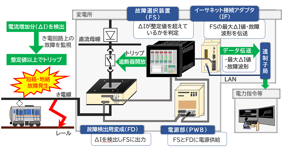直流電鉄用き電回路上で短絡・地絡故障等が発生した場合に、電流増加分(ΔI)を検出し、遮断器を開放させるための信号を発信する装置です。